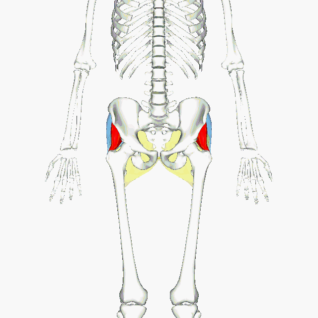 Image de gauche : Jaune = Muscle grand glutéal ; Bleu = muscle moyen glutéal ; Rouge = muscle petit glutéal